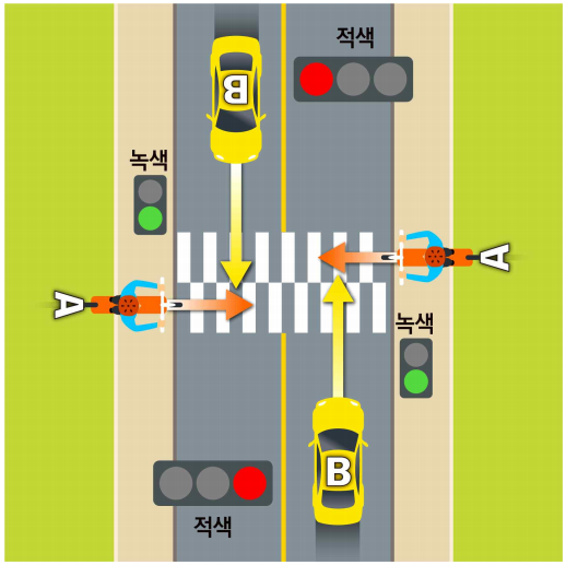 사고 상황 PM A 가 보행자 신호 적색에 횡단 자동차 B가 녹색 신호에 직진