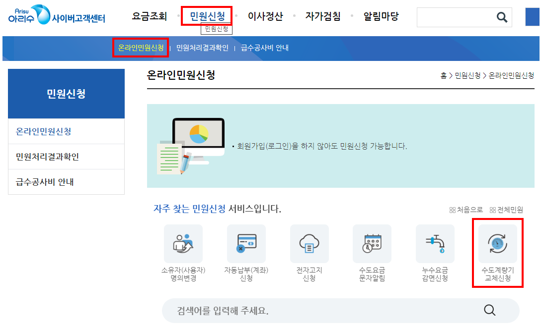민원신청 -> 온라인민원신청->수도계량기교체 신청