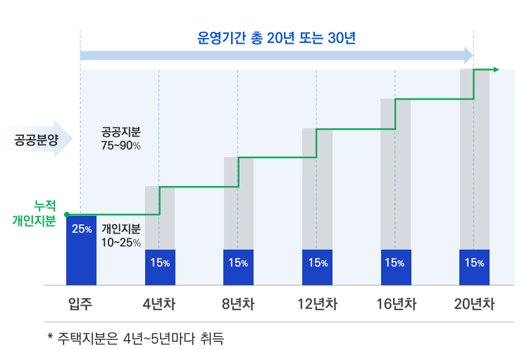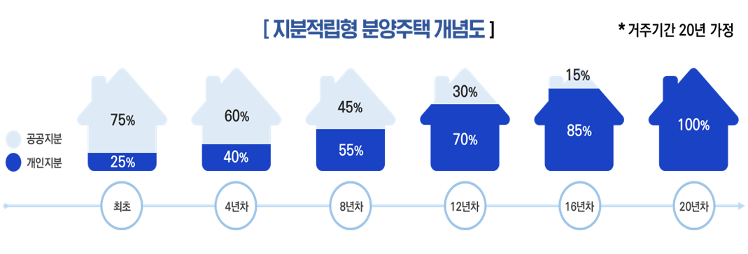 전용면적 60㎡이하 지분적립형 분양주택을 최초에 10~25% 범위에서 지분을 취득하고 20~30년에 걸쳐 나머지 지분을 분할하여 취득하는 개념입니다.