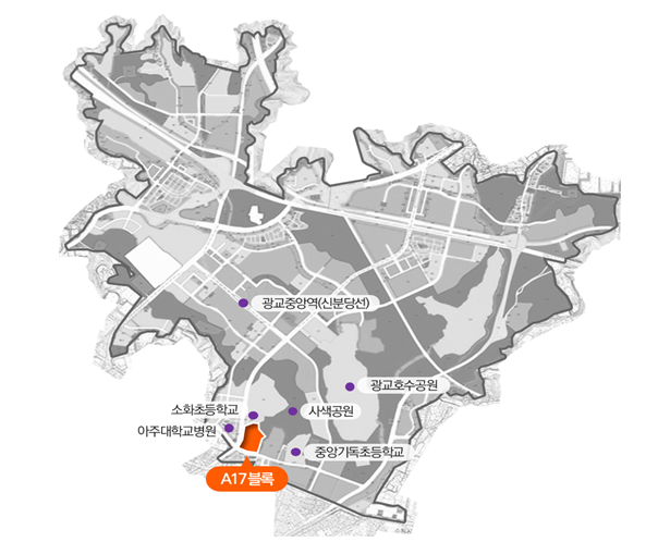 구분 내용 위치 광교신도시 내 A17블록 (수원시 영통구 원천동 80번지) 면적 40,248㎡ (약 12,200평) 용적률 150% 건폐율 50% 공급계획안 총 600호 중,