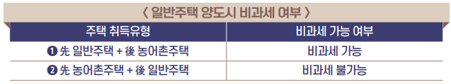 조세특례제한법에서 말하는 농어촌주택 비과세 특례는 농어촌주택 취득 전에 일반주택을 먼저 보유하고 있는 경우가 해당됩니다. 따라서 위 사례와 같이 농어촌주택을 먼저 보유하고 있는 상태에서 일반주택을 취득하고, 일반주택을 양도하게 되면 2주택 상태에서 양도하는 경우에 해당되어 비과세 적용을 받을 수 없습니다.