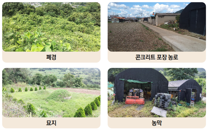 폐경, 농지로 이용되지 않은 초지, 산지 등이나 미관리되고 방치된 불경지, 묘지, 폐기물/모래/자갈적치, 골재채취장, 양어장, 정원(조경수, 관목수 등 식재), 공사장, 콘크리트포장농로, 농막, 농지의 주차장 설치, 간이저온저장고, 농지의 건축물 설치, 퇴비장 등