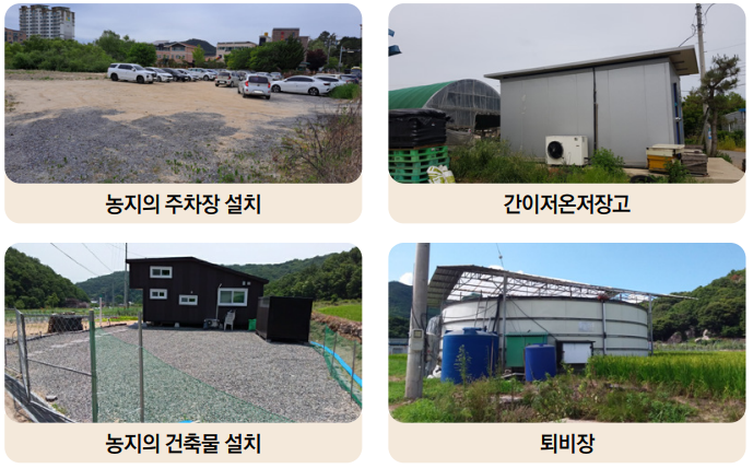 폐경, 농지로 이용되지 않은 초지, 산지 등이나 미관리되고 방치된 불경지, 묘지, 폐기물/모래/자갈적치, 골재채취장, 양어장, 정원(조경수, 관목수 등 식재), 공사장, 콘크리트포장농로, 농막, 농지의 주차장 설치, 간이저온저장고, 농지의 건축물 설치, 퇴비장 등