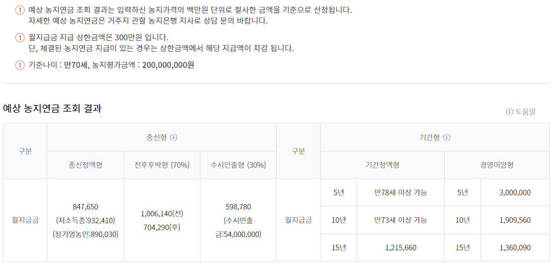 만 70세, 농지 평가금액 2억원인 경우 연금 수령액