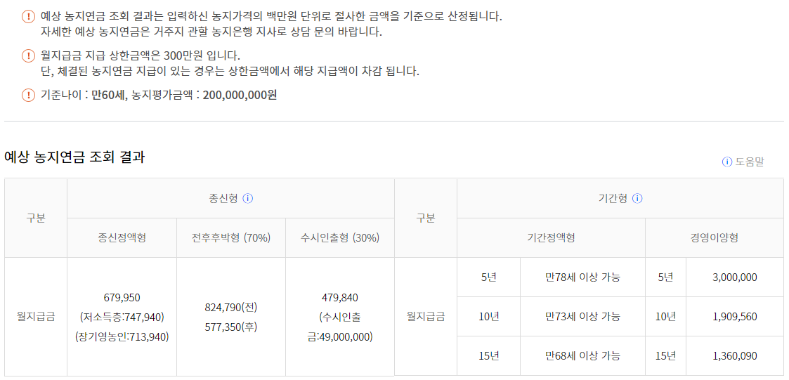 만60세, 농지 평가금액 2억원인 경우 연금 수령액