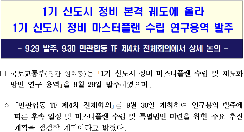 2022년 9월 30일 발표한 마스터플랜 수립 용역 계획 국토부에서는 1기 신도시 마스터플랜을 계획하는 것을 계속 언급했었고,