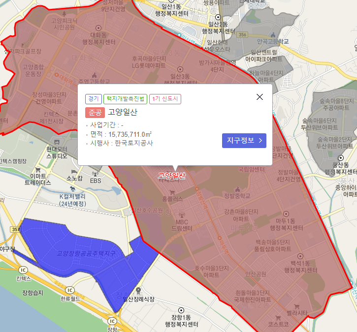 고양시 덕양구 행신동 샘터, 햇빛마을이 위치한 고양능곡 택지개발지구는 126만㎡ 면적입니다.