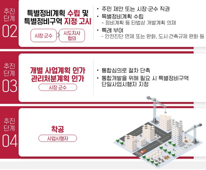 특별법이니 만큼 통합 심의 절차를 적용하여 기존 도시정비사업법 보다 간소화할 예정입니다.