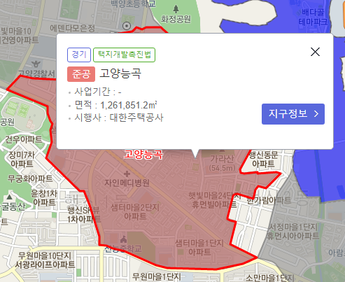 고양시 덕양구 행신동 샘터, 햇빛마을이 위치한 고양능곡 택지개발지구는 126만㎡ 면적입니다.