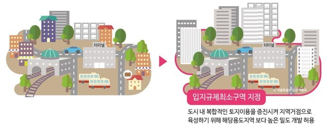 또한 특별정비구역을 도시 내 복합적인 토지이용을 증지시켜 지역거점으로 육성하기 위해 해당 용도지역 보다 높은 밀도 개발을 허용하는 입지규제최소구역으로 지정 가능하도록 하였습니다.