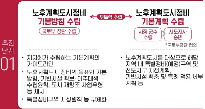 특정 노후계획도시를 대상으로 시장, 군수가 수립하는 행정계획으로 기본방침과 같이 10년 주기로 수립하며 5년마다 그 타당성을 검토합니다. (이는 기존의 도시기본계획과 비슷한 기준인 같습니다.)