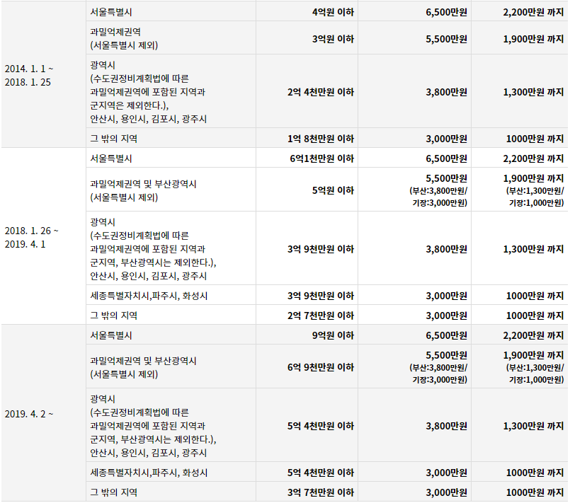 안산시, 용인시, 김포시, 광주시54,000만원 이하 3,800만원 1,300만원 까지 세종특별자치시, 파주시, 화성시 54,000만원 이하 3,000만원 1,000만원 까지 그밖의 지역 37,000만원 이하 3,000만원 1,000만원 까지 아래는 담보물권 설정일 기준으로 적용되는 전체 기간에 따른 금액입니다.