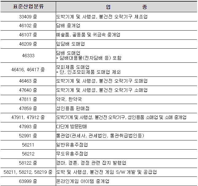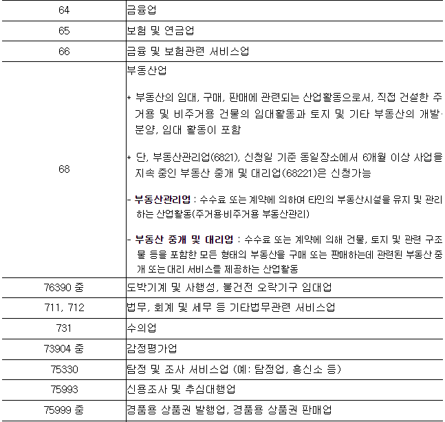-중소벤처기업부 소상공인 정책자금 융자제외 업종, 단 제외업종 판단은 연매출액이 가장 높은 주된업종으로 판단.
