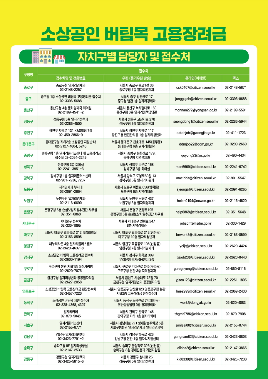 서울시 소상공인 버팀목 고용장려금 지원 신청 자격, 방법, 대상업종 [인당 300만원]지원 2023. 4. 17. 19:17반응형