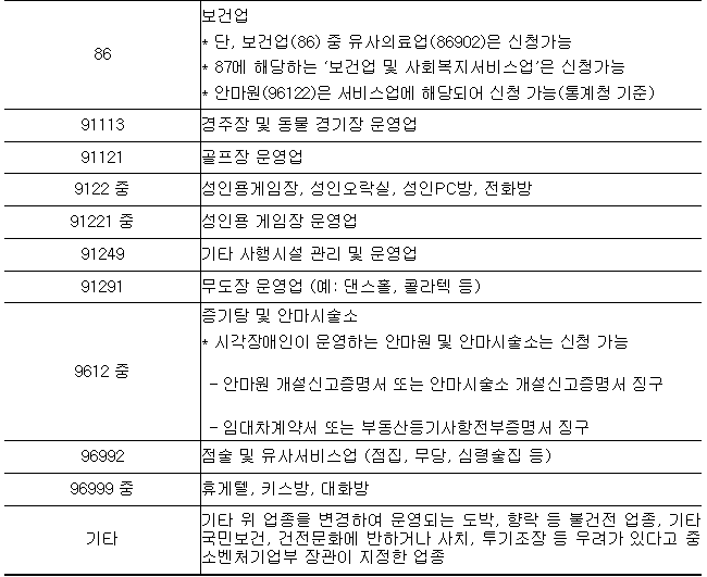 -중소벤처기업부 소상공인 정책자금 융자제외 업종, 단 제외업종 판단은 연매출액이 가장 높은 주된업종으로 판단.