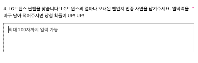 4번 항목에는 엘지트윈스의 찐팬인지, 오랜 팬인지 인증 사연을 쓰라는 항목이 있습니다. 글을 쓸 때는 LG트윈스의 찐팬이 되어서 글을 잘 쓰는 것이 좋겠습니다.^^ 저는 MBC청룡 시절까지 거슬러 올라갔습니다.^^