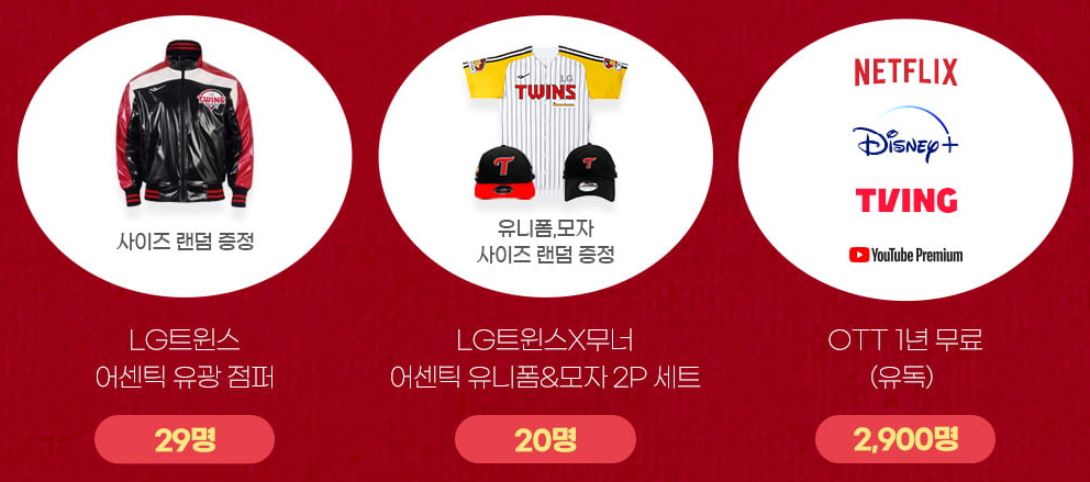 티빙, 유튜브프리미엄2,900명 LG트윈스 어센틱 유광점퍼 29명 사이즈 랜덤 LG트윈스 X무너 어센틱