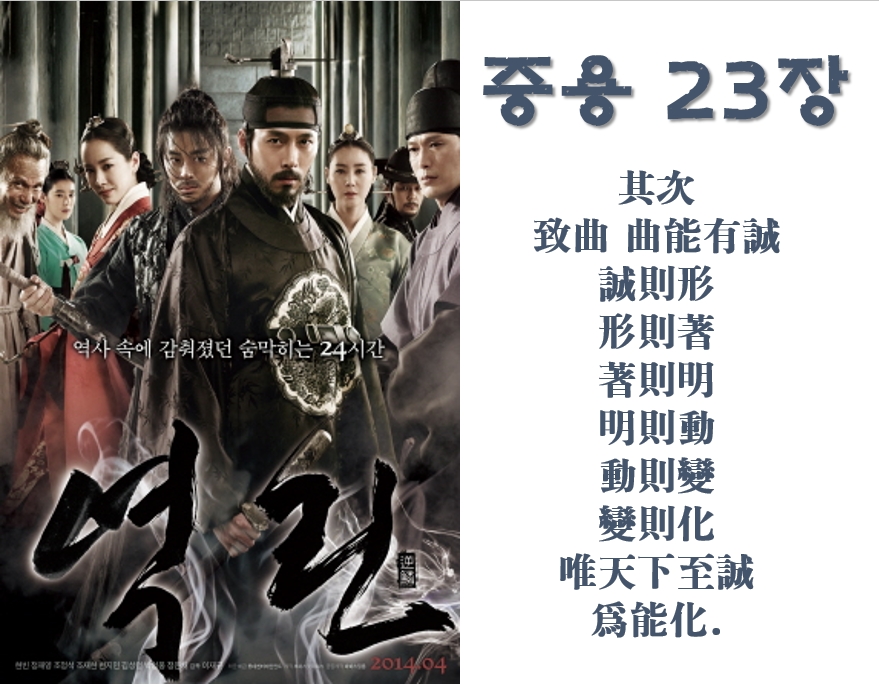 반응형역린을 2번째로 보는 것인데, 영화에 정조와 노론 문신들과의 아침 경연장면이 나오는데, 중용 23장에 관한 내용이 나옵니다. 몇년 전 처음 볼 때는 그냥 스쳐지나갔는지, 그 때도 중용 23장의 의미를 느꼈지만 - 분명 그 장면을 본 기억은 나지만 - 시간이 지나 그냥 잊고 지낸 것인지 모르겠으나, 오늘 그 말의 무게는 다르게 다가옵니다.