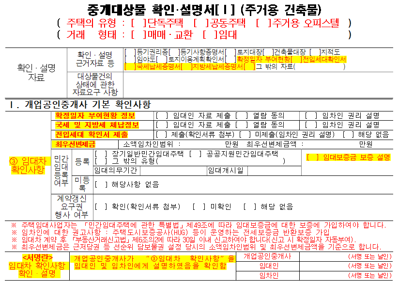 공인중개사는 안전한 주택임대차 거래를 위해서 아래 관련 내용에 대해 중개대상물 확인설명서에 작성하고 서명하여 거래 당사자인 임대인, 임차인에게 교부해야합니다.