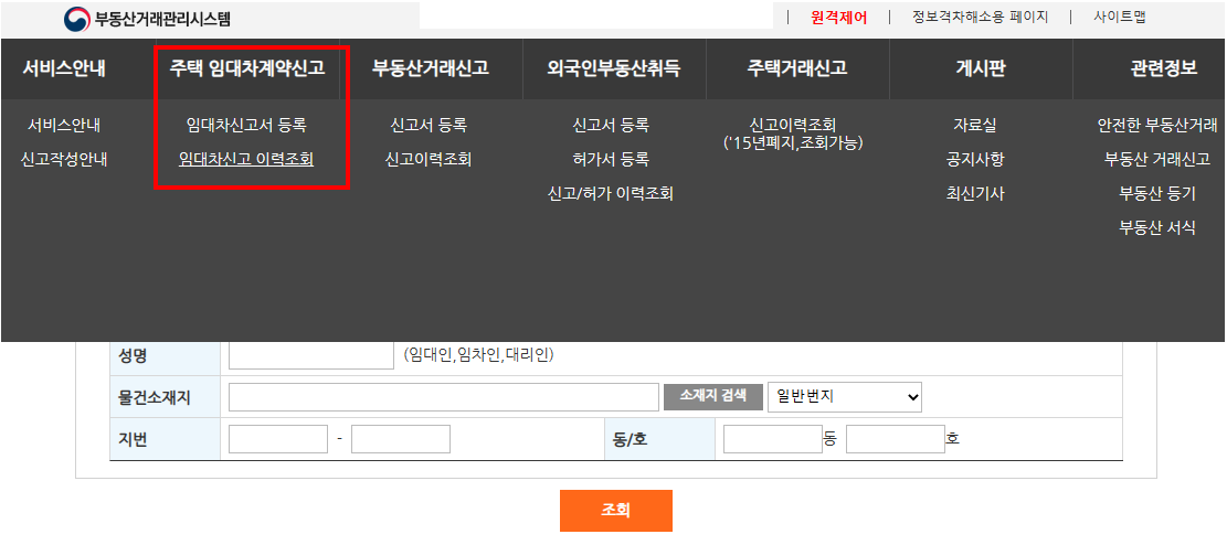 첫 메인화면에 상단에 있는 주택임대차계약신고->임대차신고이력조회를 크릭하고