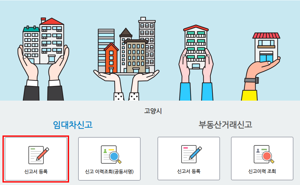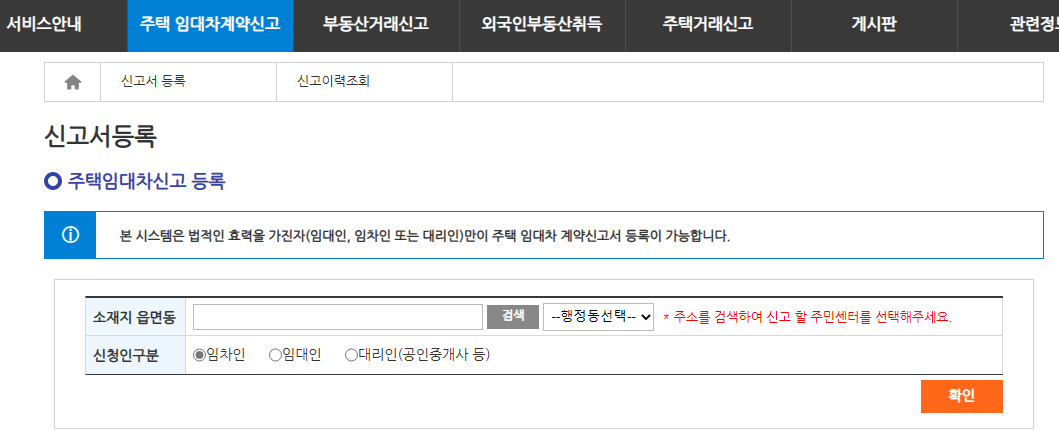 로그인을 한 후에 다시 임대차 신고 -> 신고서 등록을 클릭하면 본격적인 주택임대차신고 등록 화면이 보입니다.