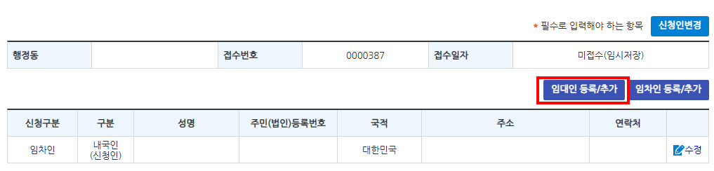임대인 등록/추가를 클릭하고 계약서의 임대인 정보를 입력합니다.