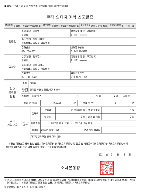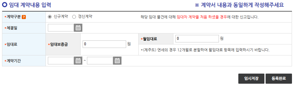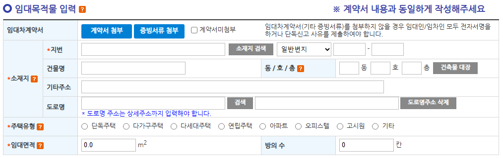 임대차계약을 한 주택에 대한 정보를 입렵합니다. 계약서와 동일하게 작성합니다.
