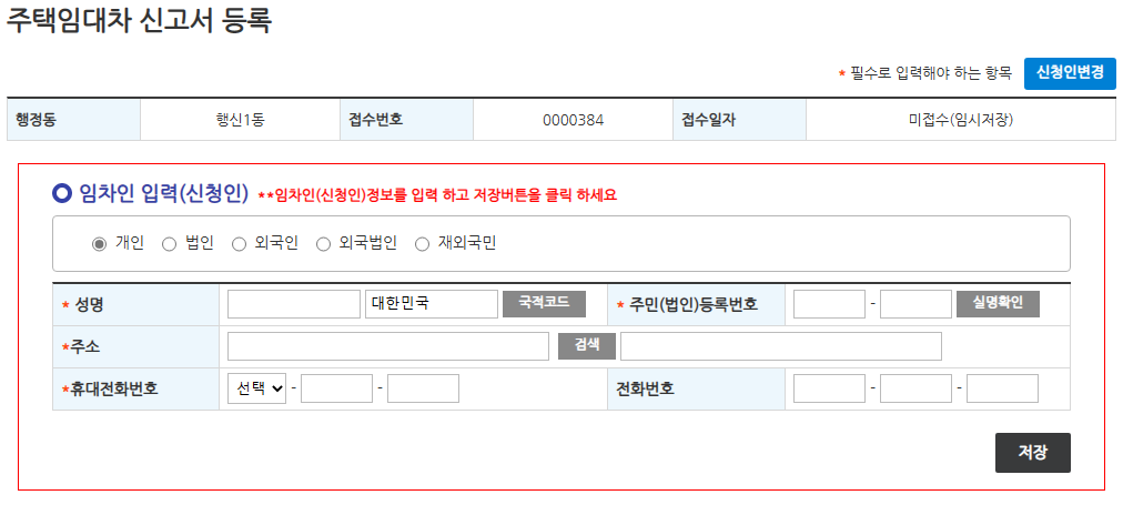 신청인의 성명, 주민번호, 주소, 핸드폰번호 등 개인정보를 입력합니다.