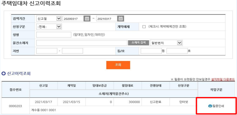 필증인쇄를 클릭하면 주택임대차계약 신고필증을 출력할 수 있습니다.