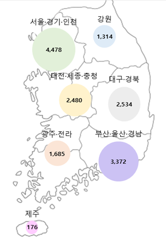 합계 서울,경기,인천 대전,세종,충청 대구,경북 부산,울산,경남 강원 광주,전라 제주 16,039 4,478 2,480 2,534 3,372 1,314 1,685 176