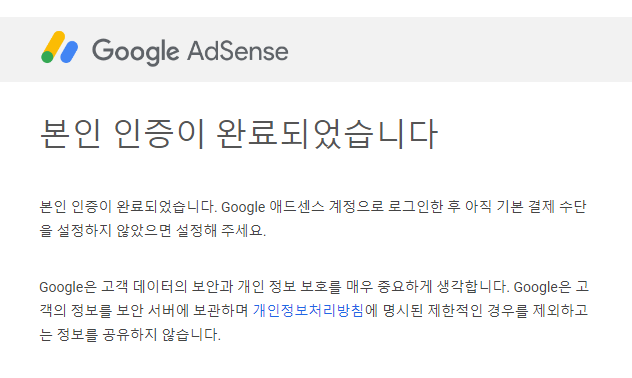 인증 완료가 되고나니 gmail로 본인인증 완료 메일이 도착했습니다.