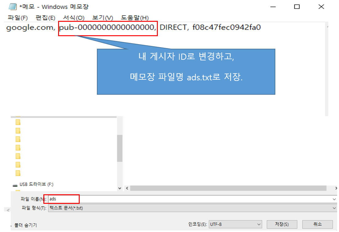 그리고 메모장 파일명을 ads.txt로 저장합니다.