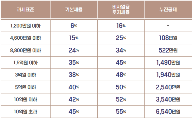 비사업용토지로 구분이 되면 양도소득세율을 적요할 때 양도차액 구간 기본 누진세율에서 +10%P 추가하여 양도세율을 적용하게 됩니다.