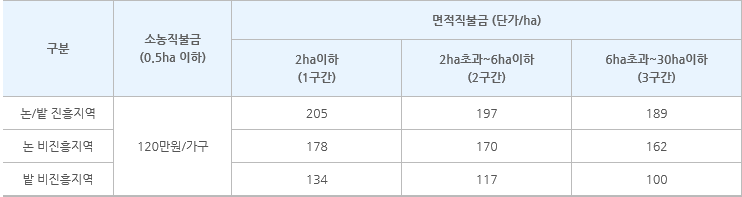 농업진흥지역 논,밭, 농업진흥지역 밖 논, 밭을 구분하여 면적 구간별로 면적이 클수록 ha당 단가가 낮아지는 역진적 단가를 적용합니다.