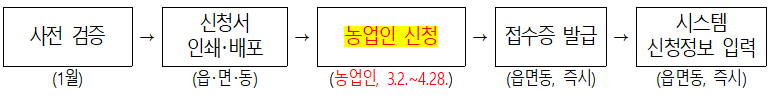 이름, 주민번호, 핸드폰인증 -> 개인정보제공동의 -> 지급대상 농업인 및 농지정보, 금액확인 -> 신청확인.