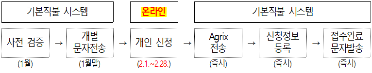 자격 요건 사전검증 결과 적격한 농업인을 대상으로 스마트폰으로 개별 문자 발송이 되고, 인터넷 등으로 신청합니다.