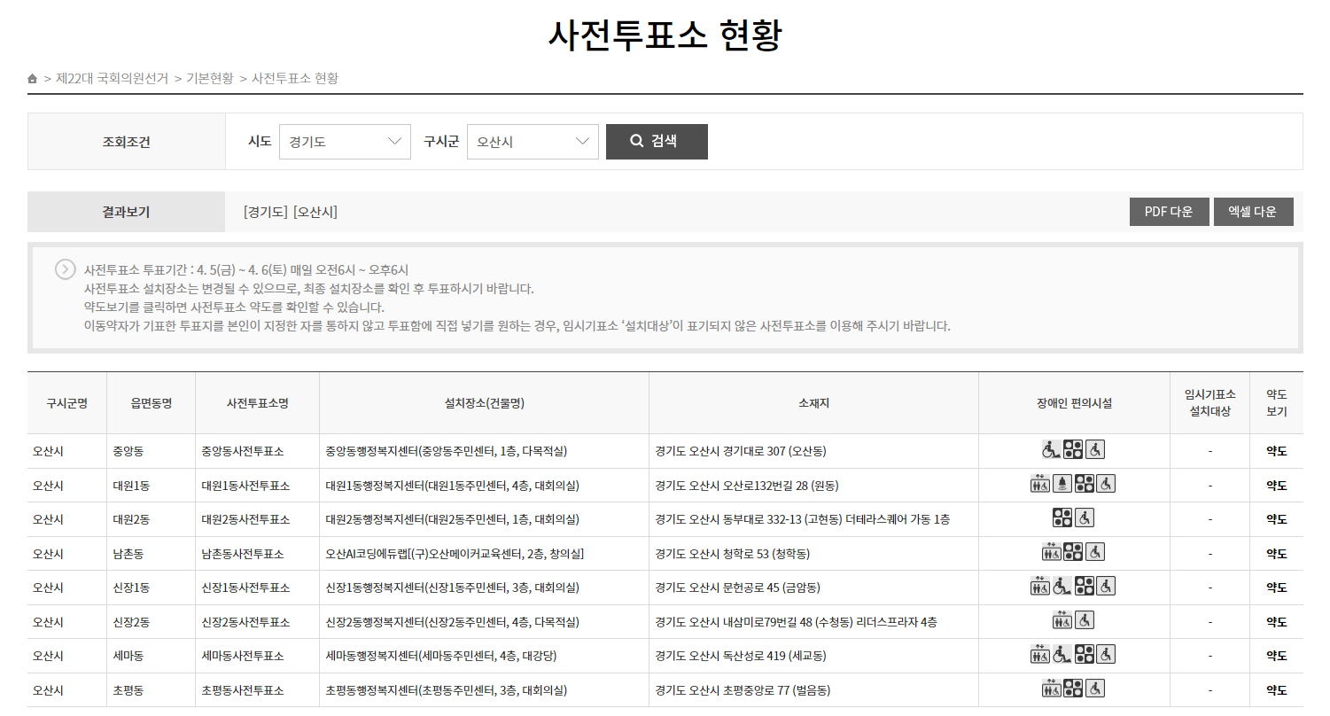 시, 군, 구를 선택하면 사전투표소 위치를 알 수 있는데요, 경기도 오산시를 조회해보니 아래와 같이 사전투표 장소가 쭉 나옵니다.