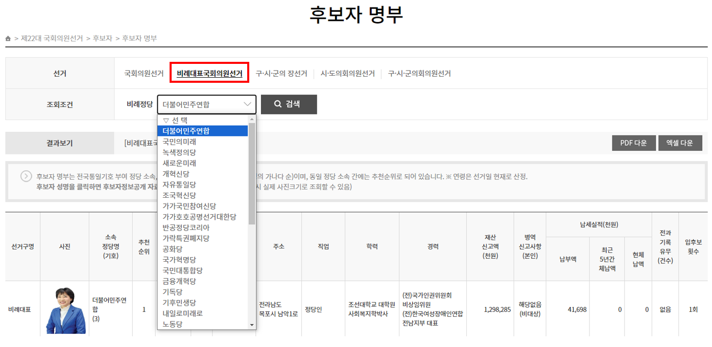 각 정당의 비례대표 국회의원 후보자 알아보기