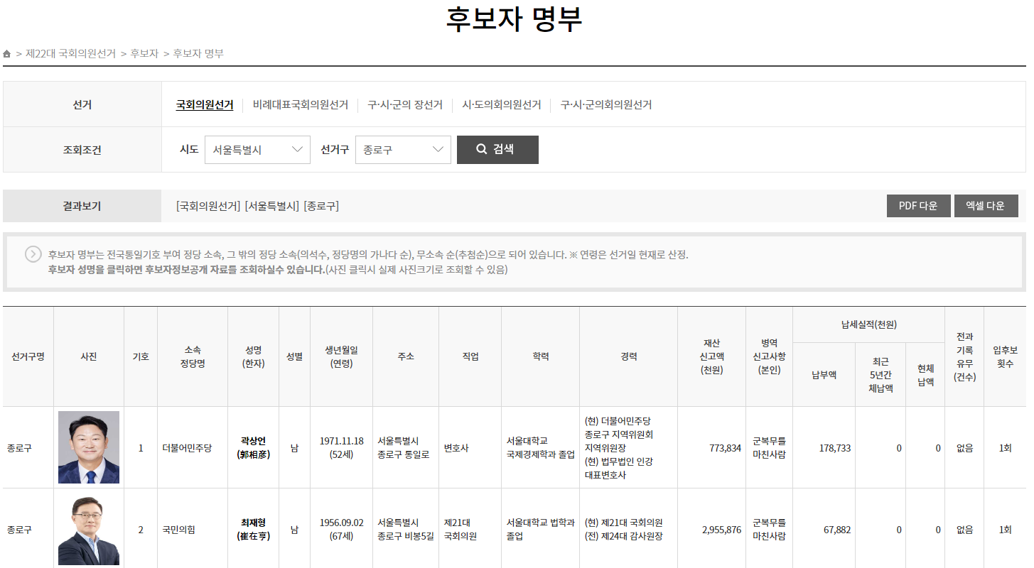 서울특별시를 선택해보니 정치1번지 종로구가 제일 먼저 나와서 검색해봤습니다.