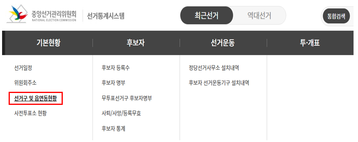 중앙선거관리위원회 통계시스템 화면에서 기본현황,후보자, 선거운동, 투/개표 표시된 검은색 부분에 마우스를 이동하면